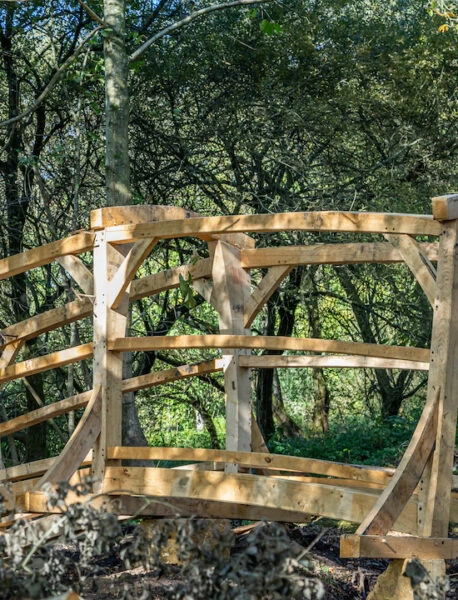 ‘The wood we used for the three bridges is quite special. It’s locally produced Devon chestnut, which was perfect for the timber-frame approach we decided on: making mortice and tenant joints, stitched together with oak pegs. I know the process well as I often help make timber framed houses and barns – like the one we built at the top of Louma.